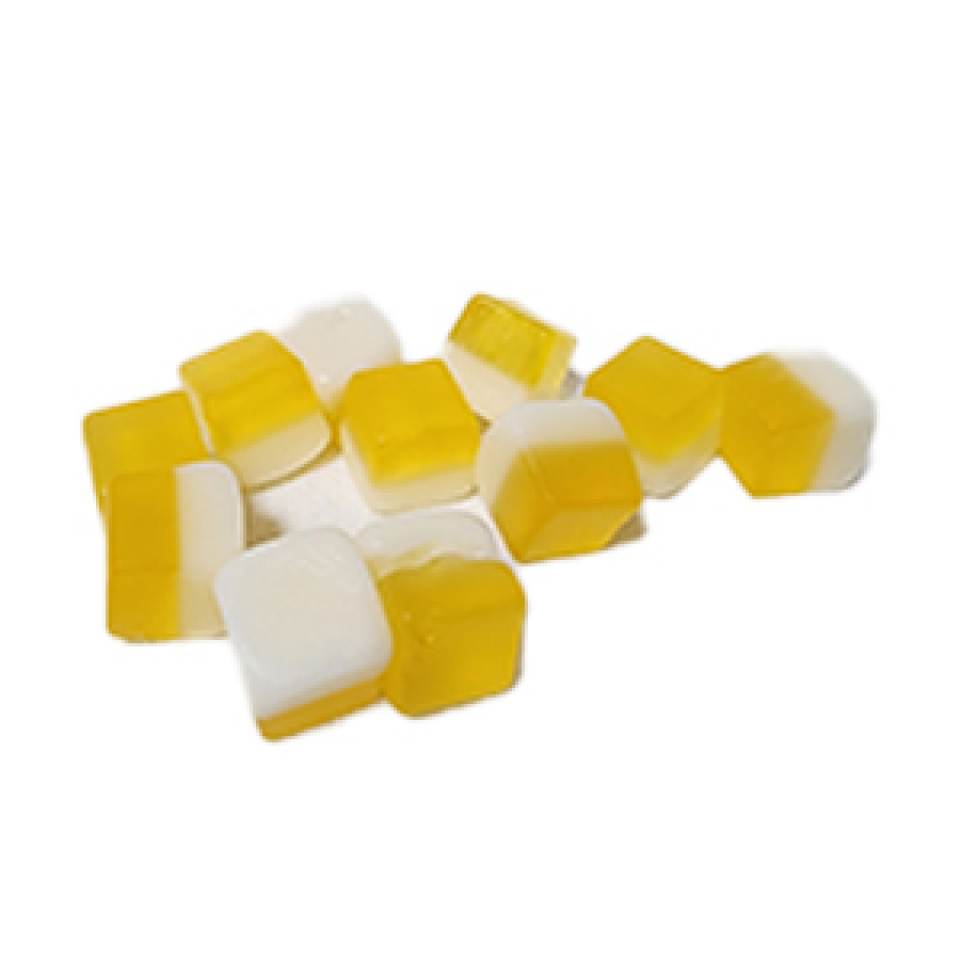白のヨーグルト味はぷにぷにし、黄色のマンゴ味はもちもちした食感が合わさった噛みごたえのあるグミです!