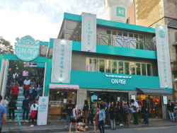 弘大(ホンデ)付近で、ミント色のかわいいビルの前にたくさんの行列ができていました。KT(Korea Tel・・・