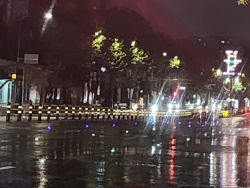 夜の雨で写真がぼやけてしまいましたが、麻浦区の一部道路の車線上にライトがありました!夜、特に雨の日は車線が見・・・