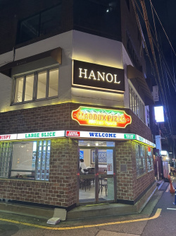 韓国風にアレンジしたイタリアン料理店「HANOL」です!外観だけみると、1階にピザ屋があって、建物全部が英語・・・